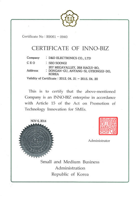 Certificate of INNO-BIZ D&D Electronics