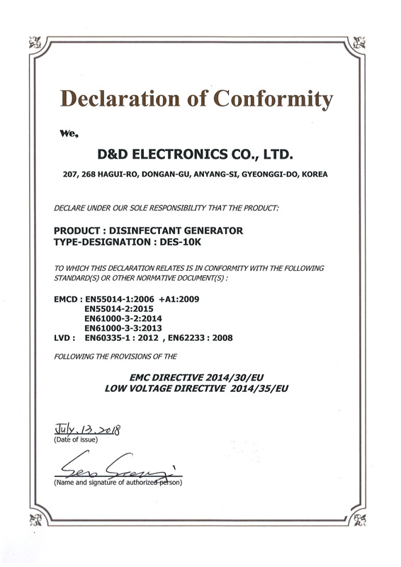 Declaration of Conformity for DES-10K D&D Electronics